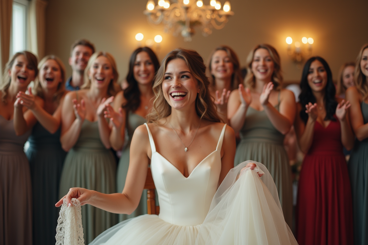 Loin d’être un détail folklorique, cette tradition attire tous les regards dès qu’elle débute. Les invités guettent chaque clin d’œil complice, savourant une animation où la tension monte, alternant rires, rivalités assumées et audaces. Le jeu de la jarretière, piloté par un animateur ou un proche, s’impose parmi les animations mariage les plus appréciées, transformant la fête en véritable scène de théâtre improvisée.